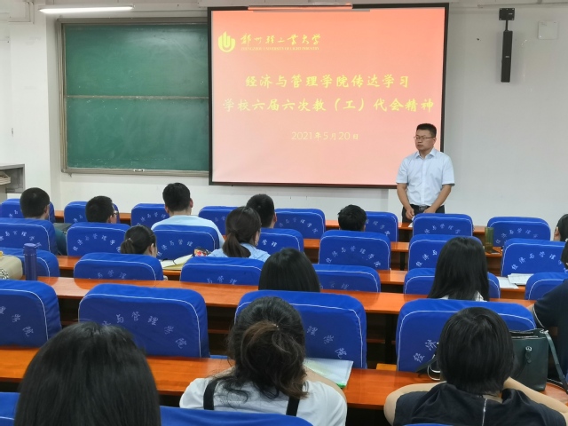 5月20日下午,经济与管理学院在经管楼211室召开全体教职工大会,传达学习学校六届六次教(工)代会精神。会议由学院党委书记张云超主持。