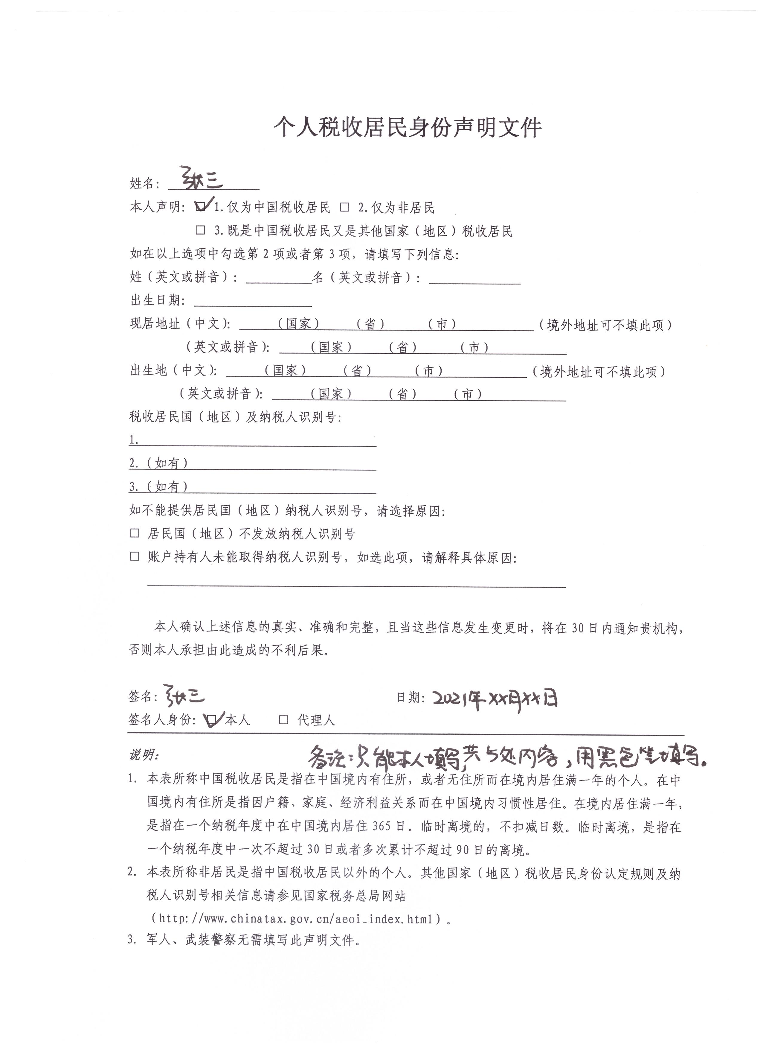 2.个人税收居民身份声明文件一份(附件2)(按样本用黑色签字笔填写5处内容,切勿多填信息,字迹工整,不能有涂改、连笔,日期以填表时间为准,样本见附件2-1);