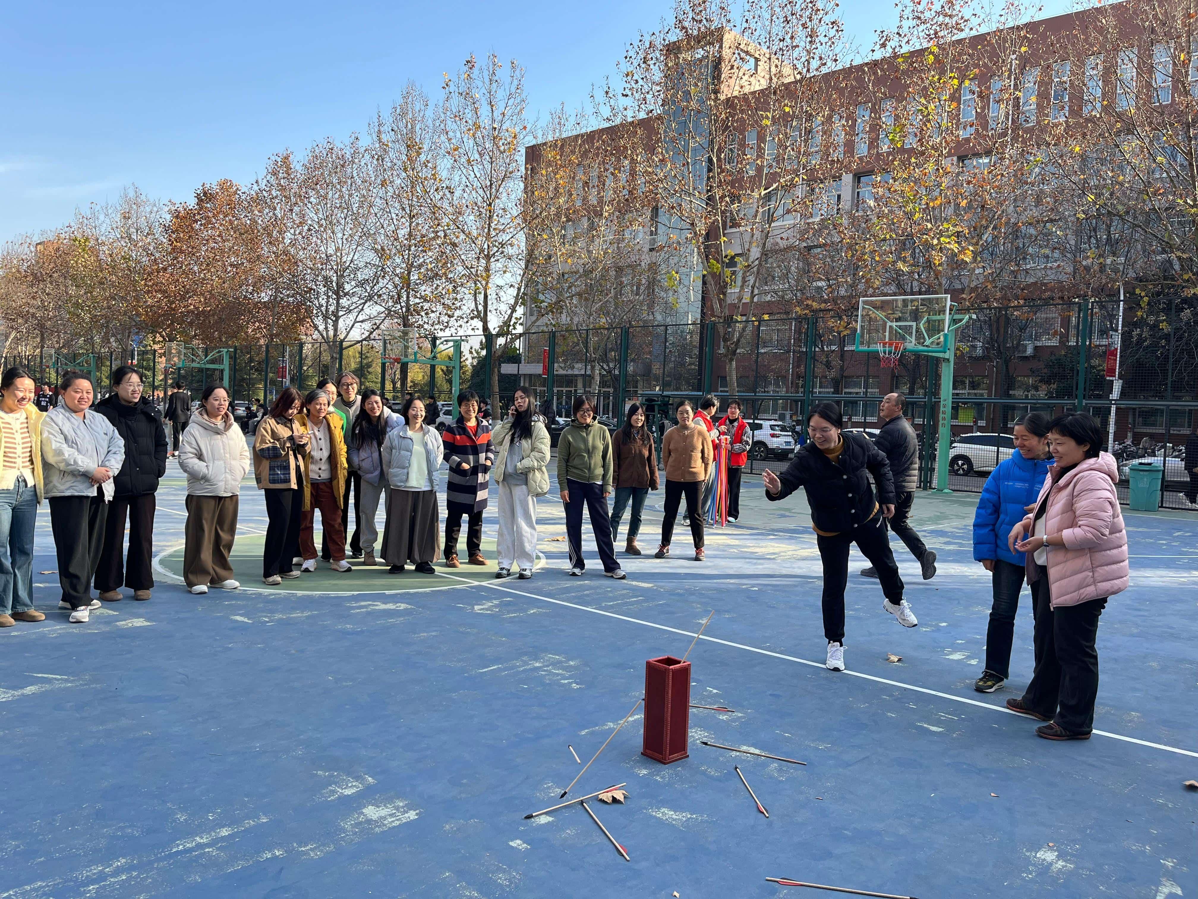 活动现场,女教职工们热情高涨、活力满满,积极参与文体活动中,充分展现出女教职工多元魅力,展现出健康向上、团结协作的精神风貌。本次活动项目有“趣味投壶”、“跳大绳”,比赛分6组进行,每组5人。比赛过程中,各小组分工会派出运动健将,按照比赛规则参与了组织的趣味投壶和跳大绳活动。活动现场气氛高涨,欢声笑语不断,充分展现了女教职工们的活力与风采。