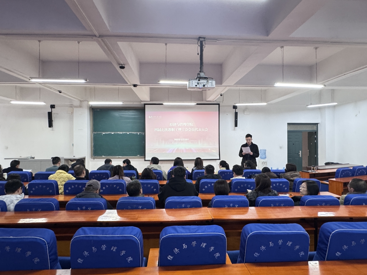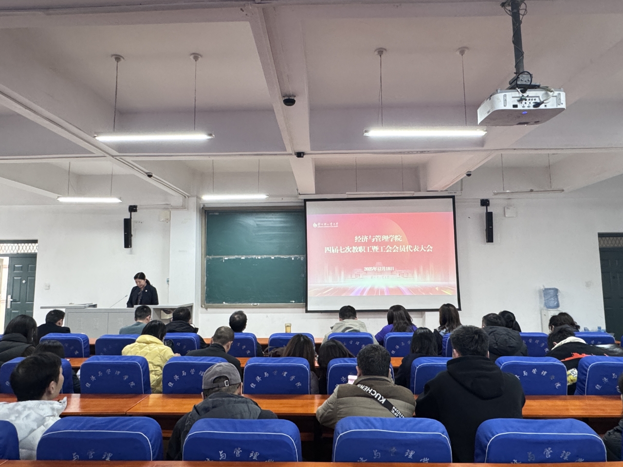 2025年12月18日下午,经济与管理学院在经管楼211召开四届七次教职工暨工会会员代表大会,全体教(工)代会代表参加了会议。会议由学院党委书记金亮主持。